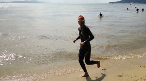 でも第1ブイを回ってからは、多少は泳げるようになったものの、折り返して陸に向かうとまたまた足がつく。